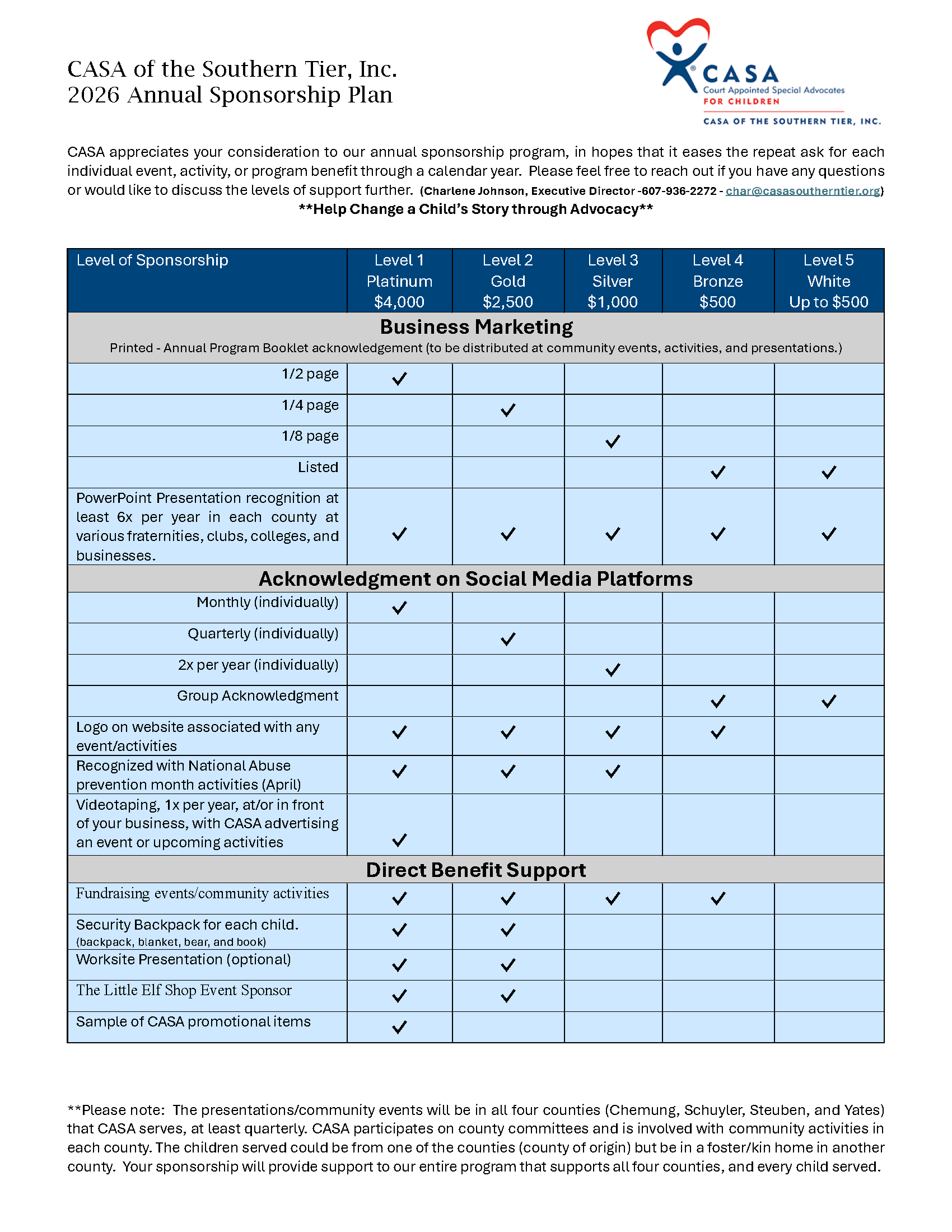 CASA (Court Appointed Special Advocate) continues to serve the area’s most vulnerable children in Chemung, Schuyler, Steuben, and Yates Counties. These children find themselves placed or at risk of being placed out of their home to no fault of their own due to neglect and abuse situations.